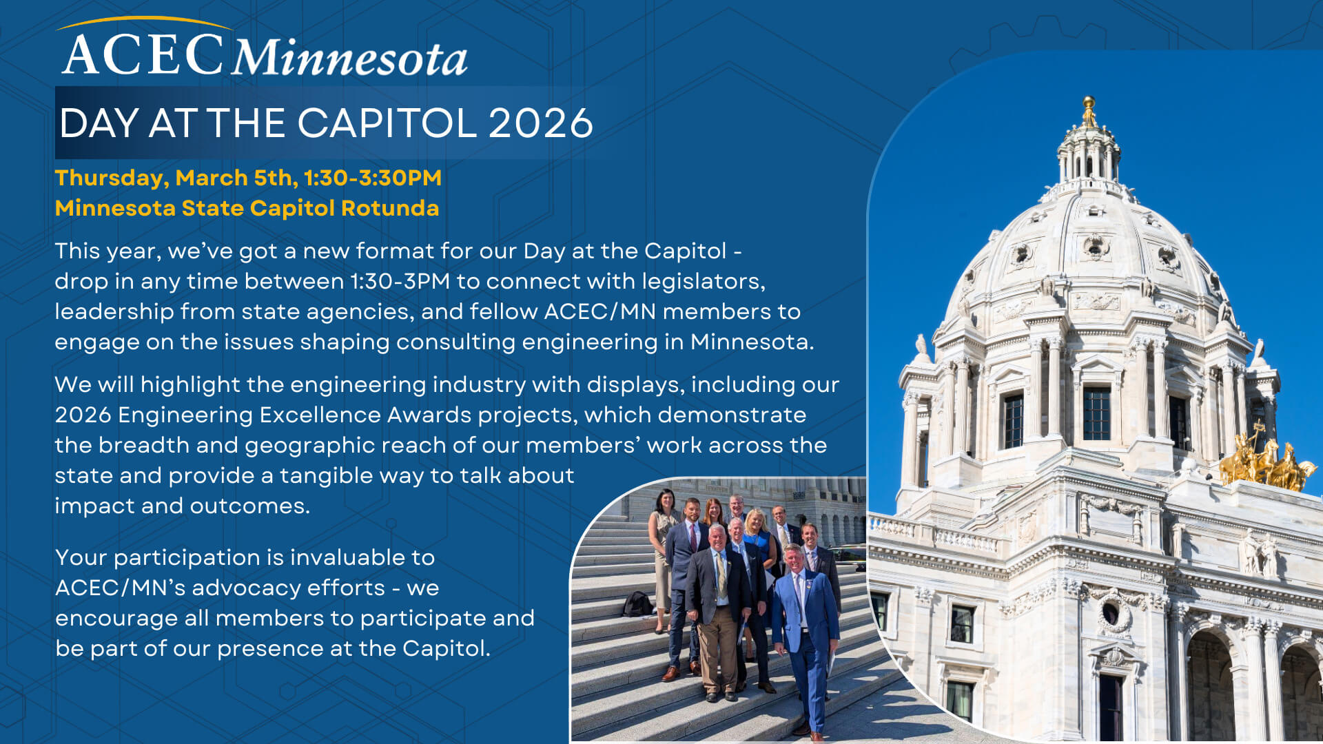 Founded in 1949, the American Council of Engineering Companies of Minnesota (ACEC/MN) advocates for consulting engineering firms. With over 125 member companies and 7,500 employees, ACEC/MN serves federal, state, local governments, private industry, and the public.