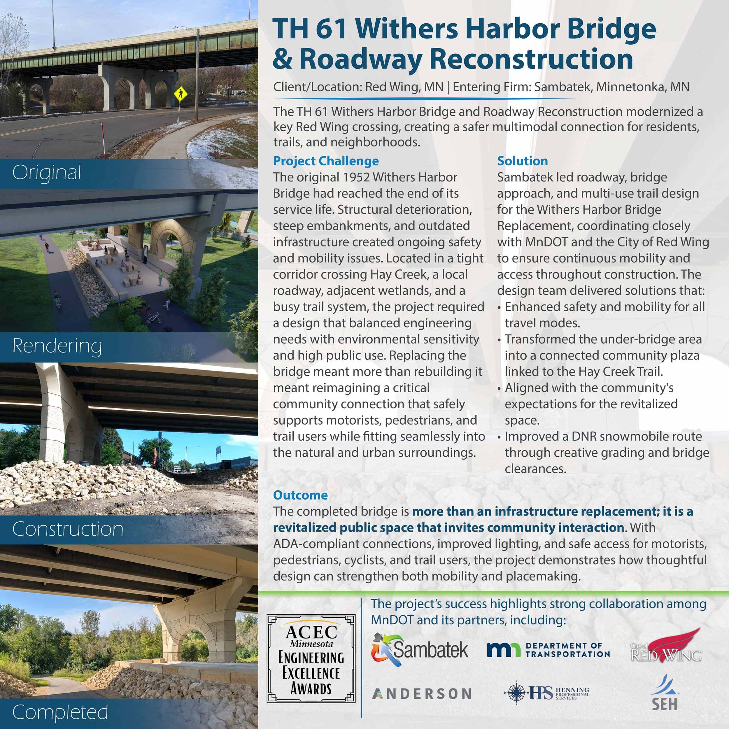 Each year, the American Council of Engineering Companies of Minnesota (ACEC/MN) organizes the Engineering Excellence Awards (EEA) competition, which celebrates engineering achievements in new infrastructure projects and research. Consulting Engineering Firms from around the state submit projects and research studies and a distinguished panel of judges evaluates projects on five categories: